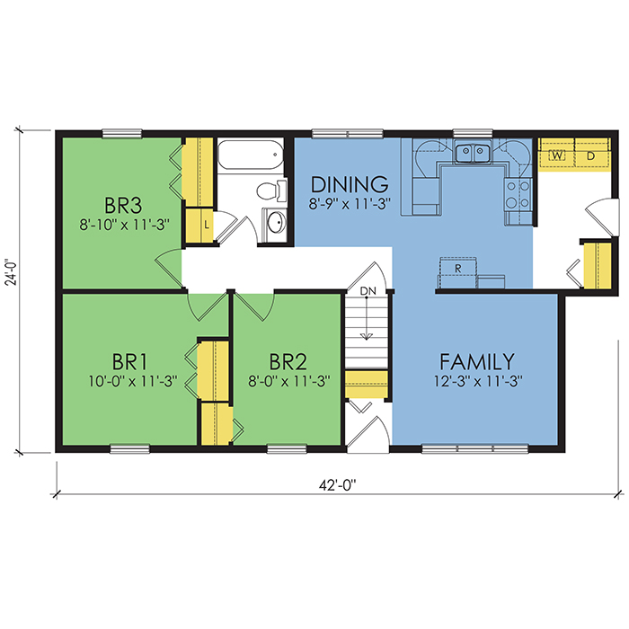 A part of our Wausau Originals, the Homestead floor plan features 3 bedrooms and 1 bathroom with a foot print of 42x24 feet and 961 total square feet of living space. Floor Plan #WO104