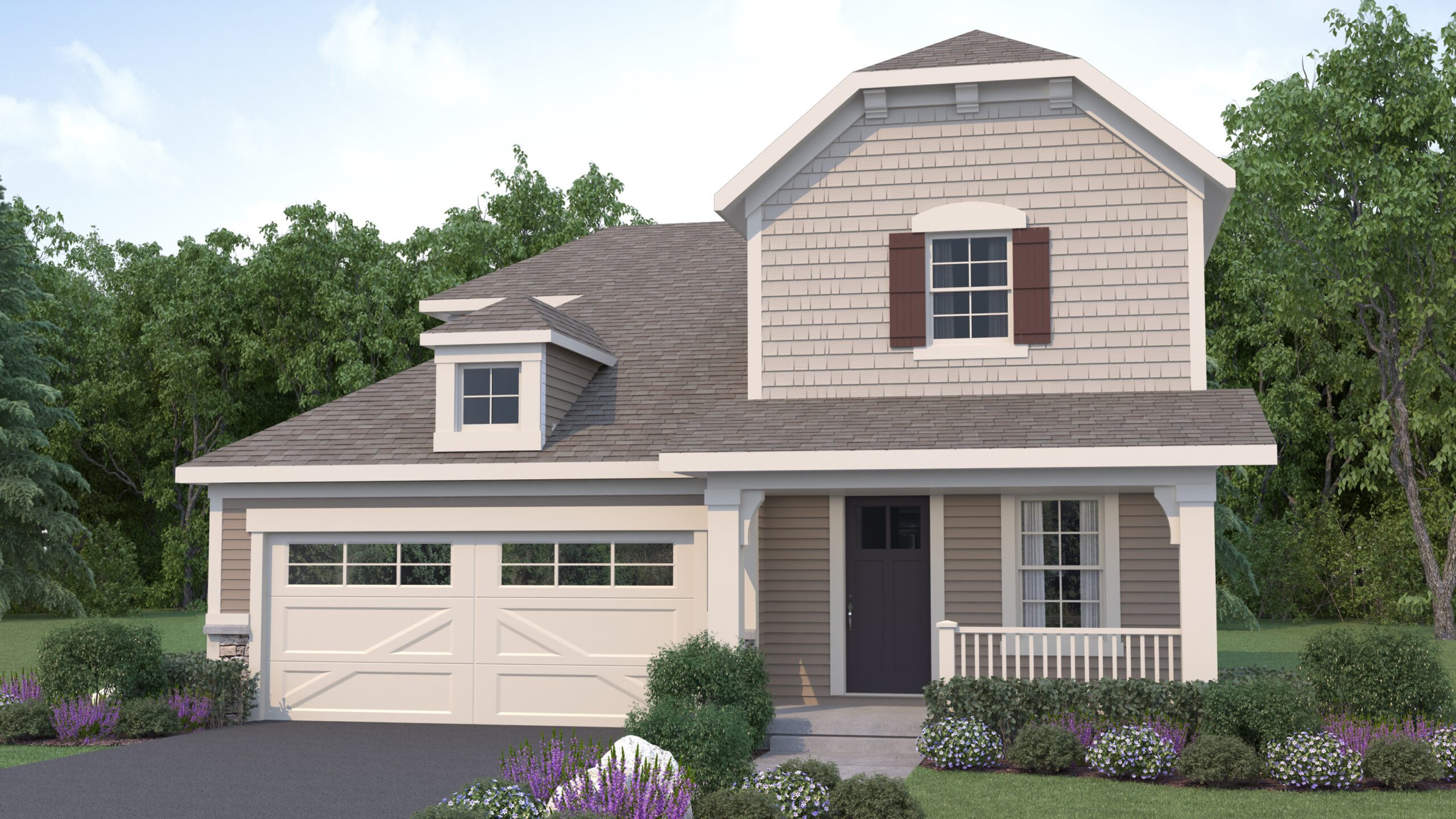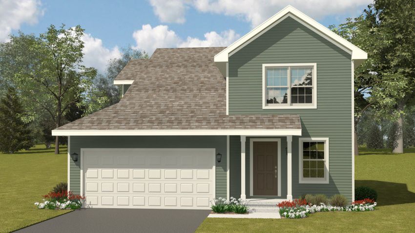Exterior rendering of Jack Pine floor plan in the Country Exterior Style. 3 bed/2.5 bath floor plan Country