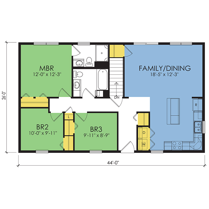 A part of our dream series, the tamarack floor plan features 3 bedrooms and 1.5 bathrooms with a foot print of 44x30 feet and 1342 total square feet of living space.